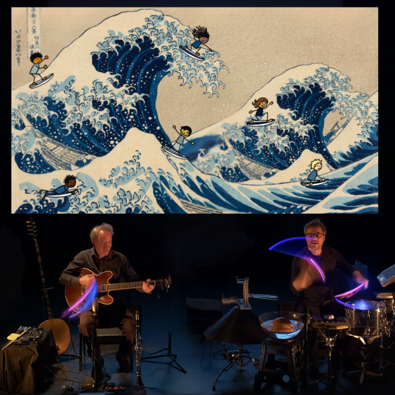 Les musiciens sur scène avec leur instrumentarium incroyable associant guitare électrique, luth oriental, clarinette et percussion d’eau, de cailloux, de tiges de verres ou encore de feuilles de papier, nous emmènent dans un monde de couleurs sonores hypnotiques, virtuoses et poétiques.
